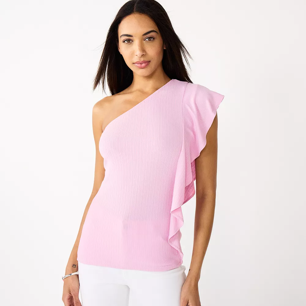 Turn heads in this gorgeous women’s one-shoulder flutter sleeve top from Nine West.